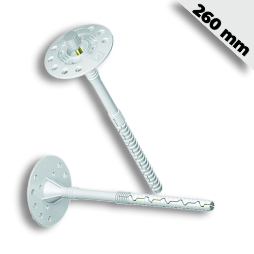 260 mm-es nagy méretű tárcsás, hosszú osztósíkú kialakítás, biztos tartás érdekében. Gyors és egyszerű telepítés. Kiemelkedő mechanikai stabilitás. Lyukacsos téglához, gázbetonhoz, könnyű betonhoz. A műanyaggal bevont fej meggátolja a korróziót és a hőhíd hatás kialakulását